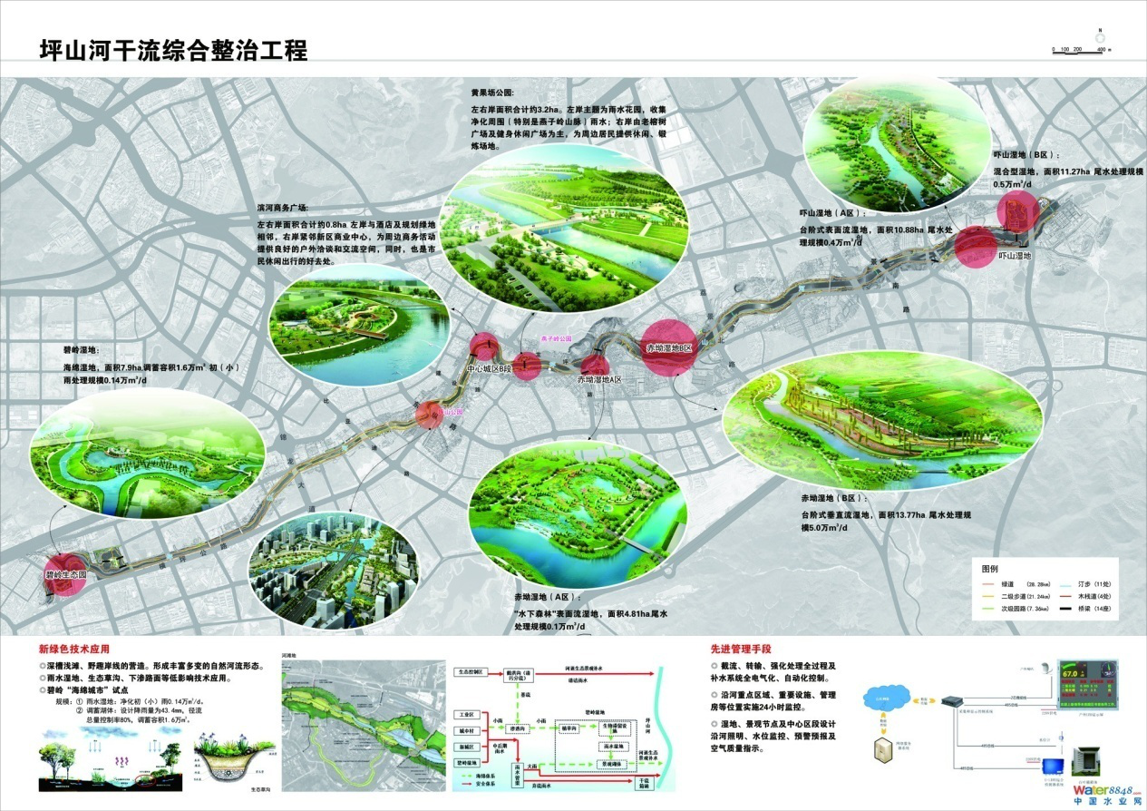 坪山河項目在政策引領(lǐng)、上位規(guī)劃的基礎(chǔ)上,創(chuàng)新性的提出了以水資源、水環(huán)境、水安全、水生態(tài)、水文化“五位一體”的治水理念和“治污、防洪、生態(tài)修復”+“城市建設(shè)”的“3+1”治水思路。